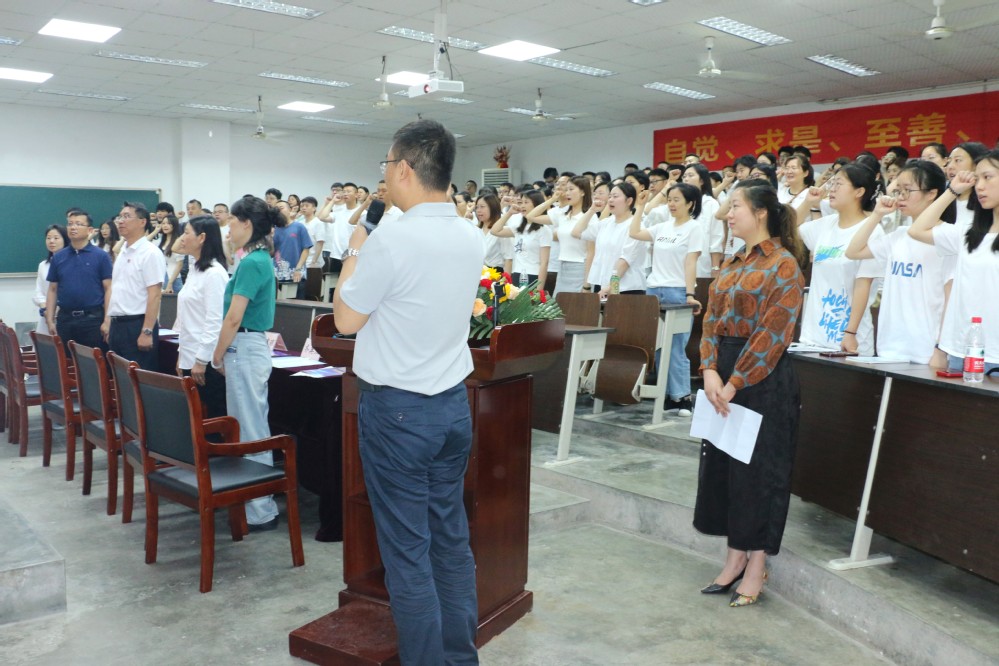 张志强副院长带领全体新生宣读药学生誓词,共同许下“弘扬神农伟业、建树万世之功、为了人类的健康与发展而努力奋斗”的誓言。之后,与会老师为新生代表佩戴上了中国药科大学校徽,开学典礼在校歌声中圆满结束。