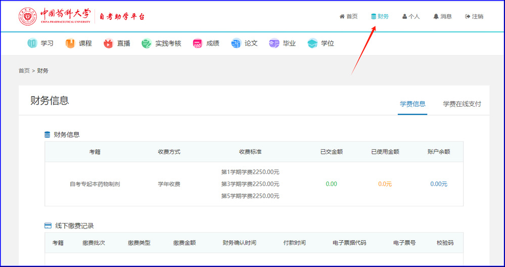 点击右上角财务,可看到学费信息,点击学费在线支付,立即缴费。