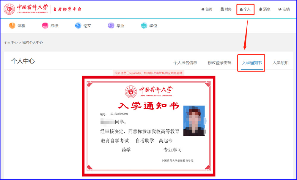 (五)学院会对考生进行资格审核,资格审核通过后,在报名系统中发放入学通知书。