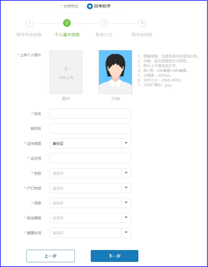 特别提醒:个人照片必须上传,上传时注意图像规格及要求。请按标准要求提供。