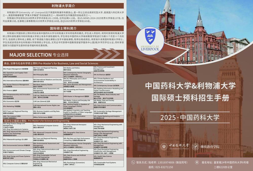 ◆利物浦大学国际硕士预科项目采用中国药科大学与利物浦大学共同培养的模式。