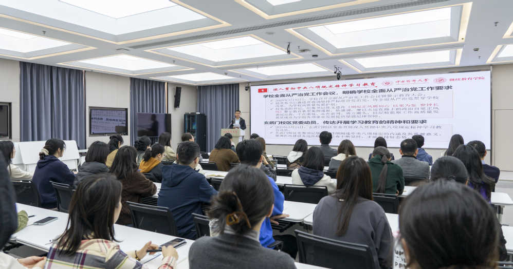 张志强从“学校深入贯彻中央八项规定精神学习教育”“中共中央八项规定具体内容、历史沿革”和“对标八项规定、深挖业务潜能”三个方面具体阐释了深入贯彻中央八项规定精神的目的、意义、核心内容以及对继续教育事业高质量发展的要求,提高了全体教职工的思想认识,发挥了重要的警示作用。
