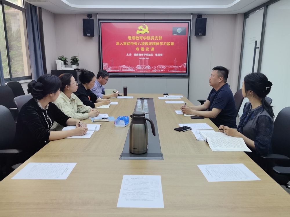 同时,结合学院继续教育工作实际,张杨彬强调指出:一是希望全体党员将廉洁思维深度融入日常工作中,涉及公务接待、差旅、外出学习培训、调研走访等要严格按规定组织安排;二是要进一步梳理学院业务工作中潜在的风险点,充分发挥纪委干部的主观能动性,出台相关规定细则,完善内部治理体系;三是要将学习教育走实走深,每周的固定学习日分享要结合工作实际展开,突出问题导向,共同学习研讨,以小切口撬动内部大治理,在勇于作为的同时将八项规定内化为思想自觉,外显为行动标杆,助力学院各项事业稳步前行。