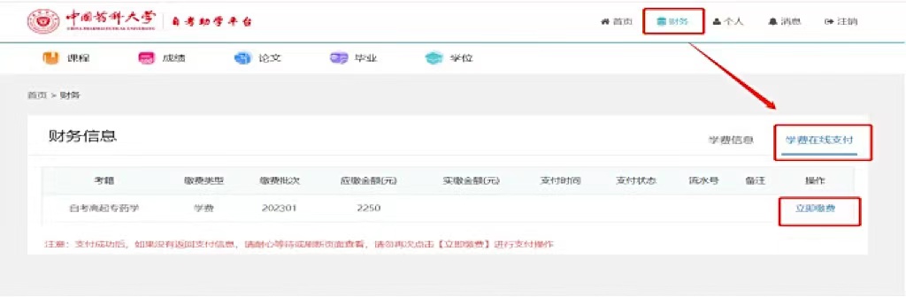 二、在个人登录页面,点击上方“财务”按钮进入,选择“学费在线支付”-“立即缴费”。