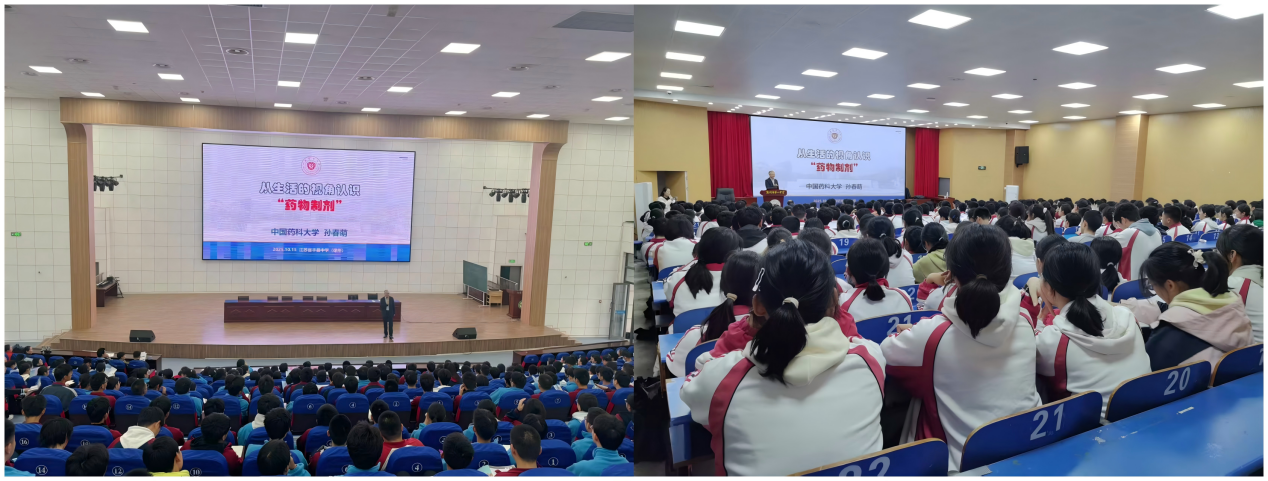 期间孙春萌教授分别丰县中学、新沂一中1100名学生开展科普讲座,以从生活的视角认识“药物制剂”,用通俗语言解读药物制剂的原理、应用及前沿发展,让抽象的药学知识变得鲜活易懂,现场反响热烈学生掌声不断