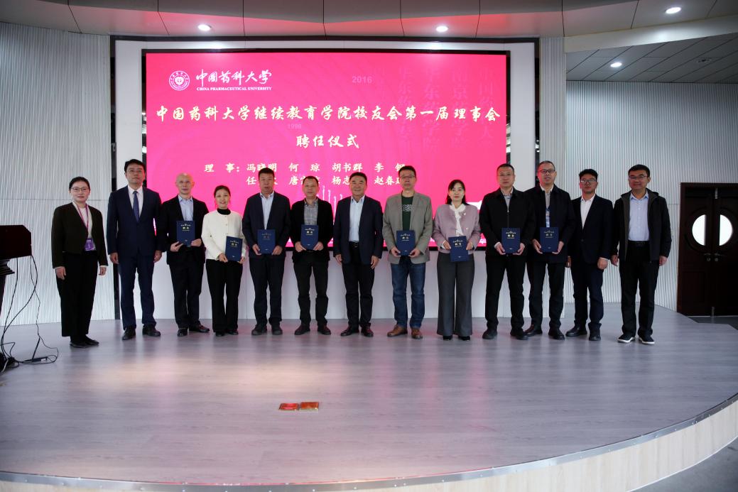 继续教育学院校友会成立环节,狄斌宣布了《中国药科大学继续教育学院校友会机构设置及任职人员名单》,为继续教育学院校友会揭牌与会领导为第一届理事会成员颁发聘书,副会长蒲开富作为校友会代表发言。
