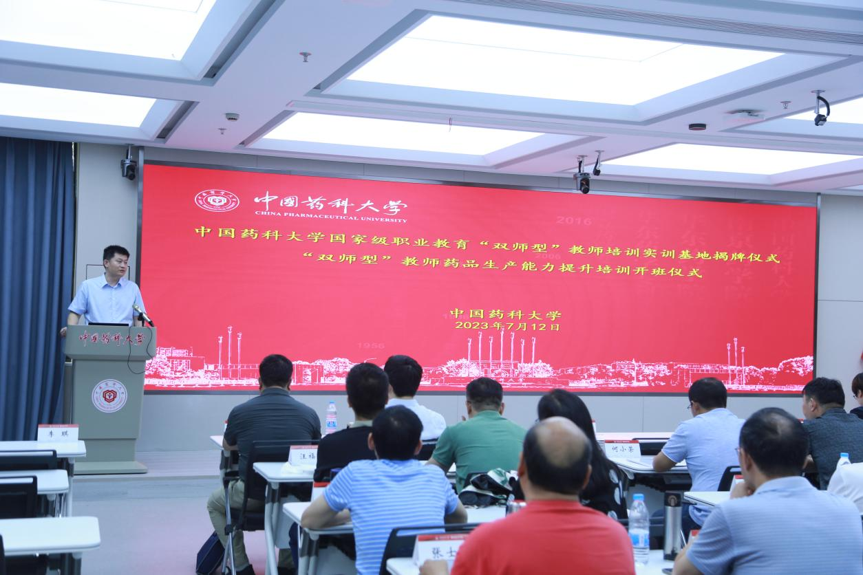 7月12日下午,由我校继续教育学院举办的中国药科大学国家级职业教育“双师型”教师培训实训基地揭牌暨“双师型”教师药品生产能力提升培训开班仪式在玄武门校区6号楼三楼报告厅举行。我校继续教育学院院长张永泽工学院院长蔡挺、副院长明广奇,药大制药有限公司副总经理倪滨斌、党总支书记郝静梅出席仪式,仪式由继续教育学院培训部主任李琪主持。